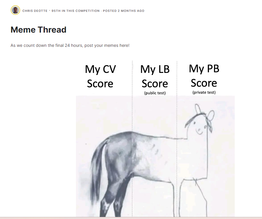 例えば疲れ果てたKagglerが定期的に立てるMeme threadはメダルを稼ぐ絶好の機会です。